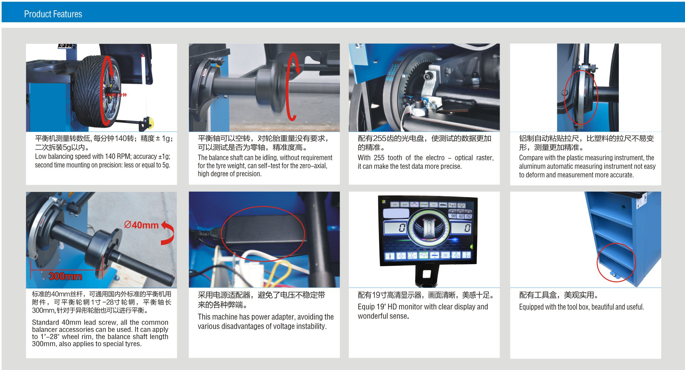 5. el tornillo de posicionamiento del estándar 40m m, todos los accesorios comunes del balanceador puede ser utilizado. Puede aplicarse al borde de la rueda de la pulgada 1-28, la longitud 300m m del eje de la balanza, también se aplica a los neumáticos especiales.